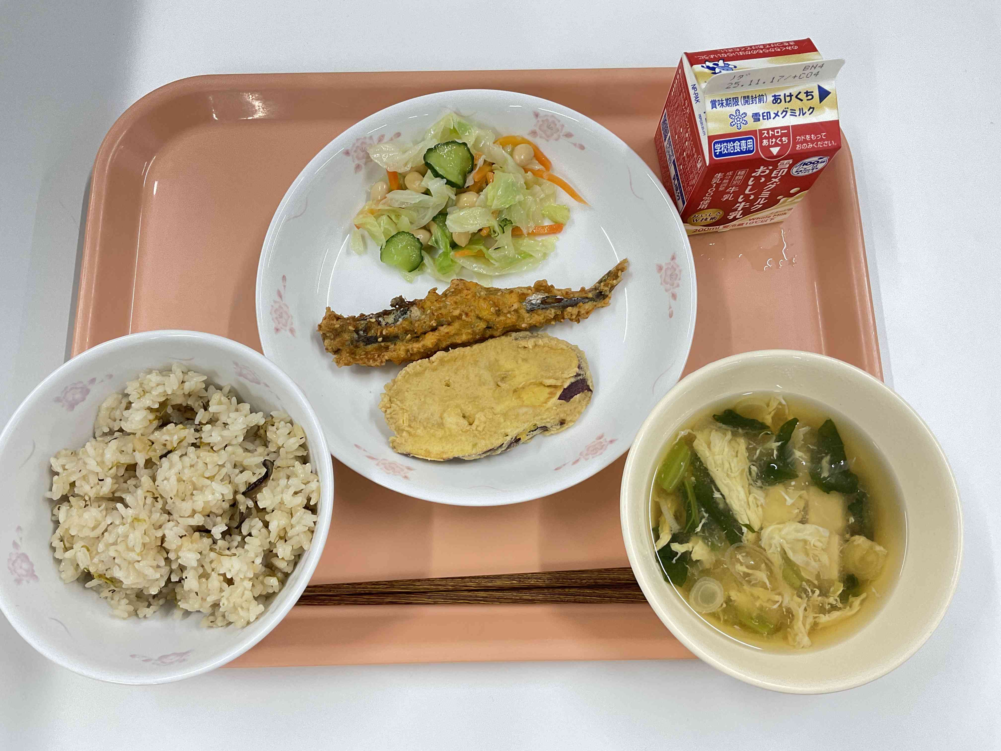 ~文化の日メニュー~ ○牛乳 ○菊花ごはん ○ししゃものもみじ揚げ ○天ぷら(さつまいも) ○大豆入りゆで野菜 ○かき玉汁