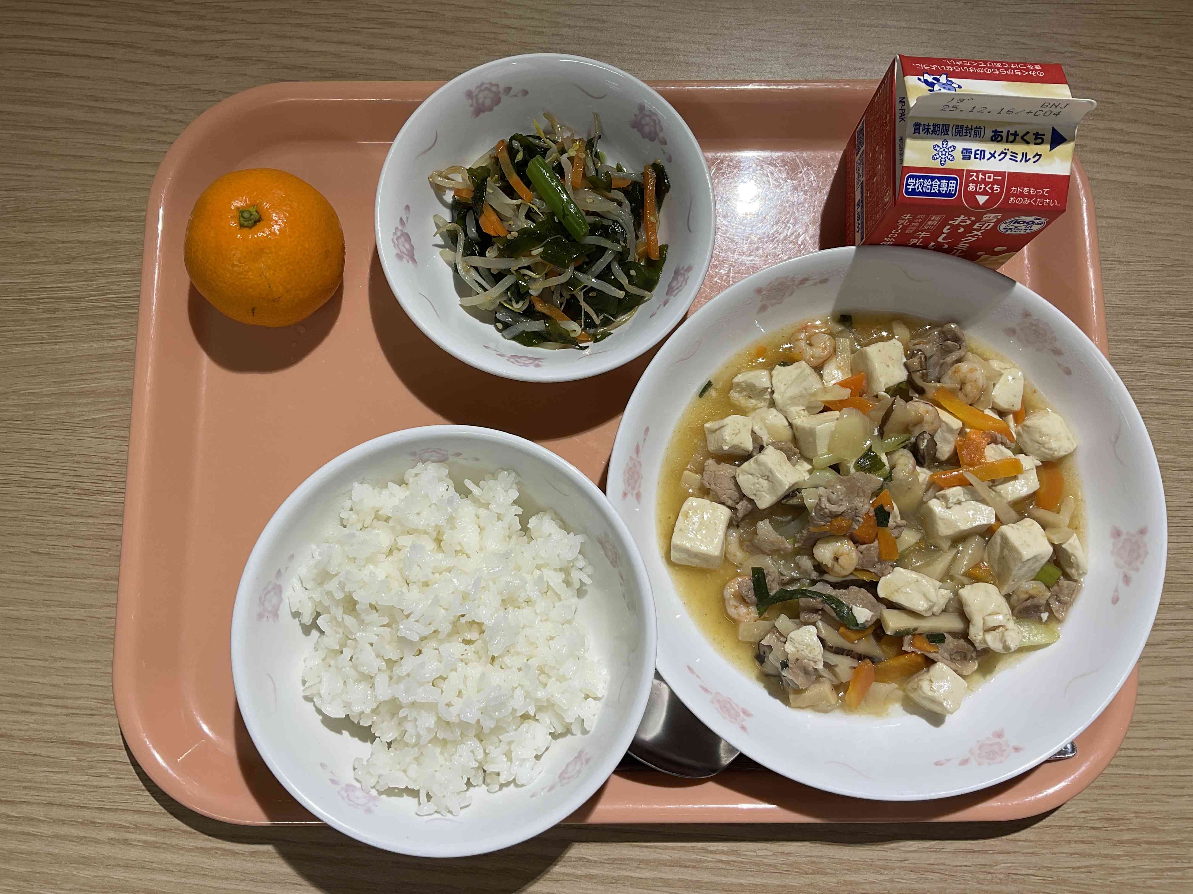 ○牛乳 ○ご飯 ○豆腐とえびの旨煮 ○もやしとわかめのごま醤油 ○みかん