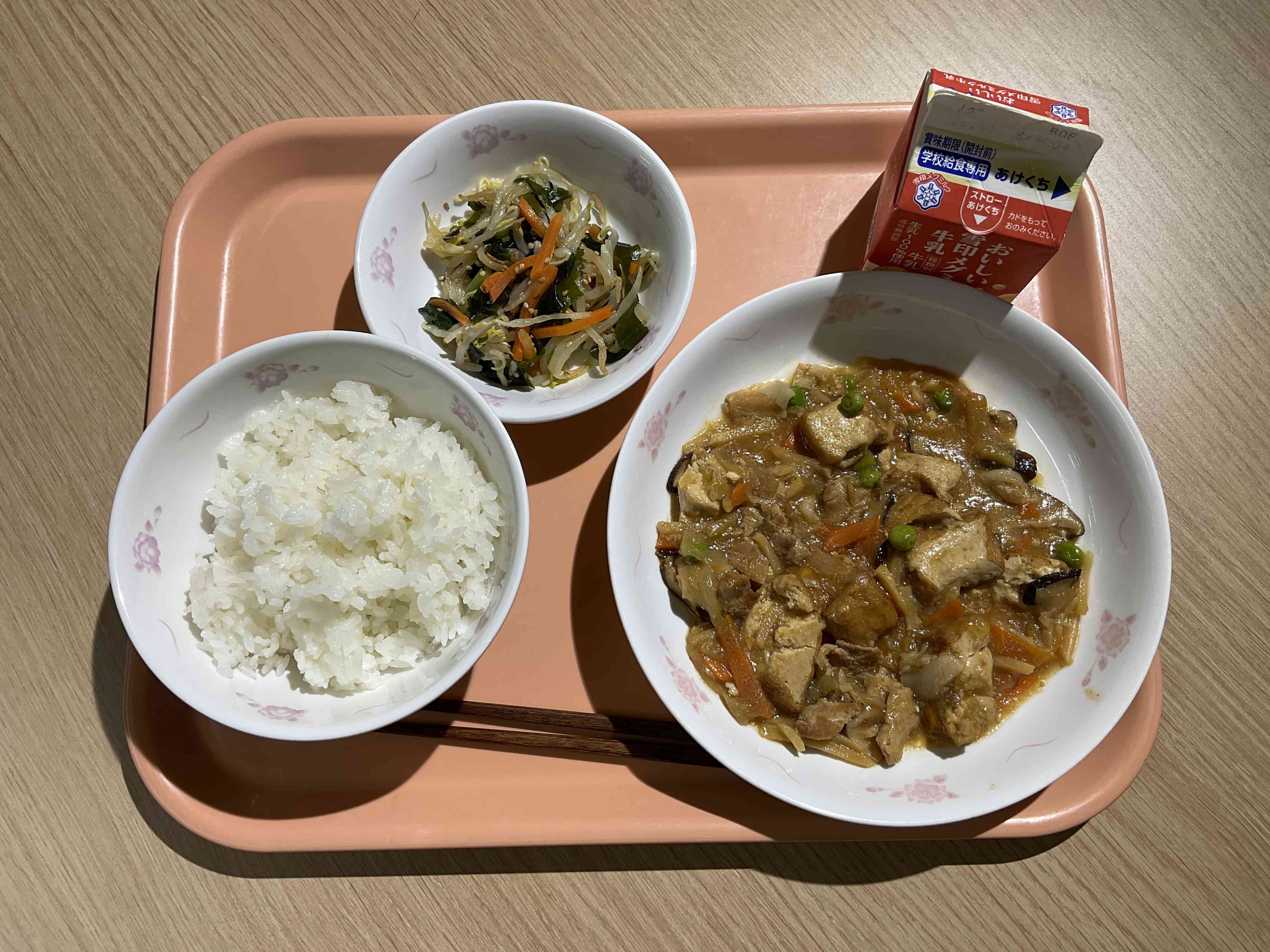 〇牛乳 〇ご飯 〇生揚げの中華煮 〇もやしとわかめのごま醤油
